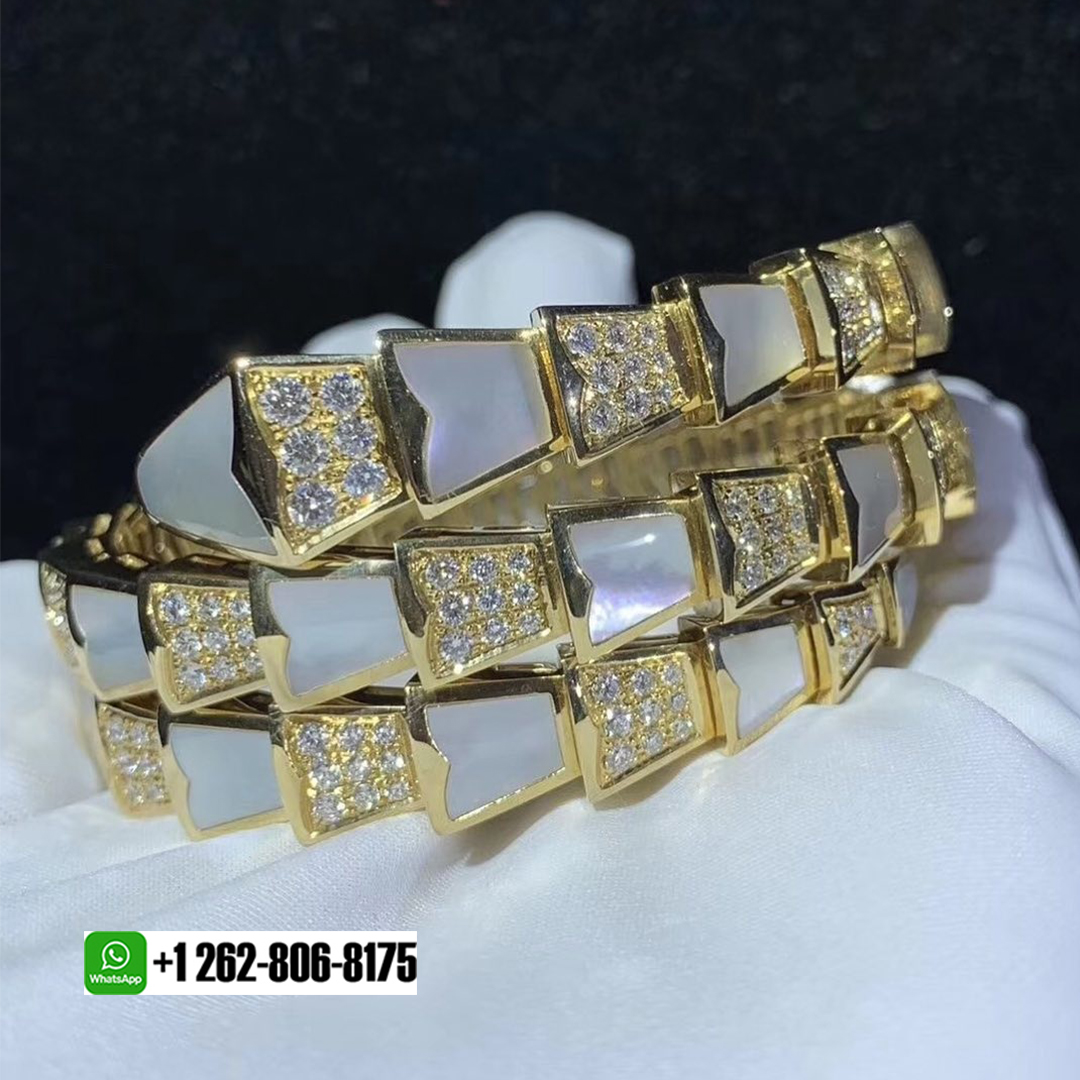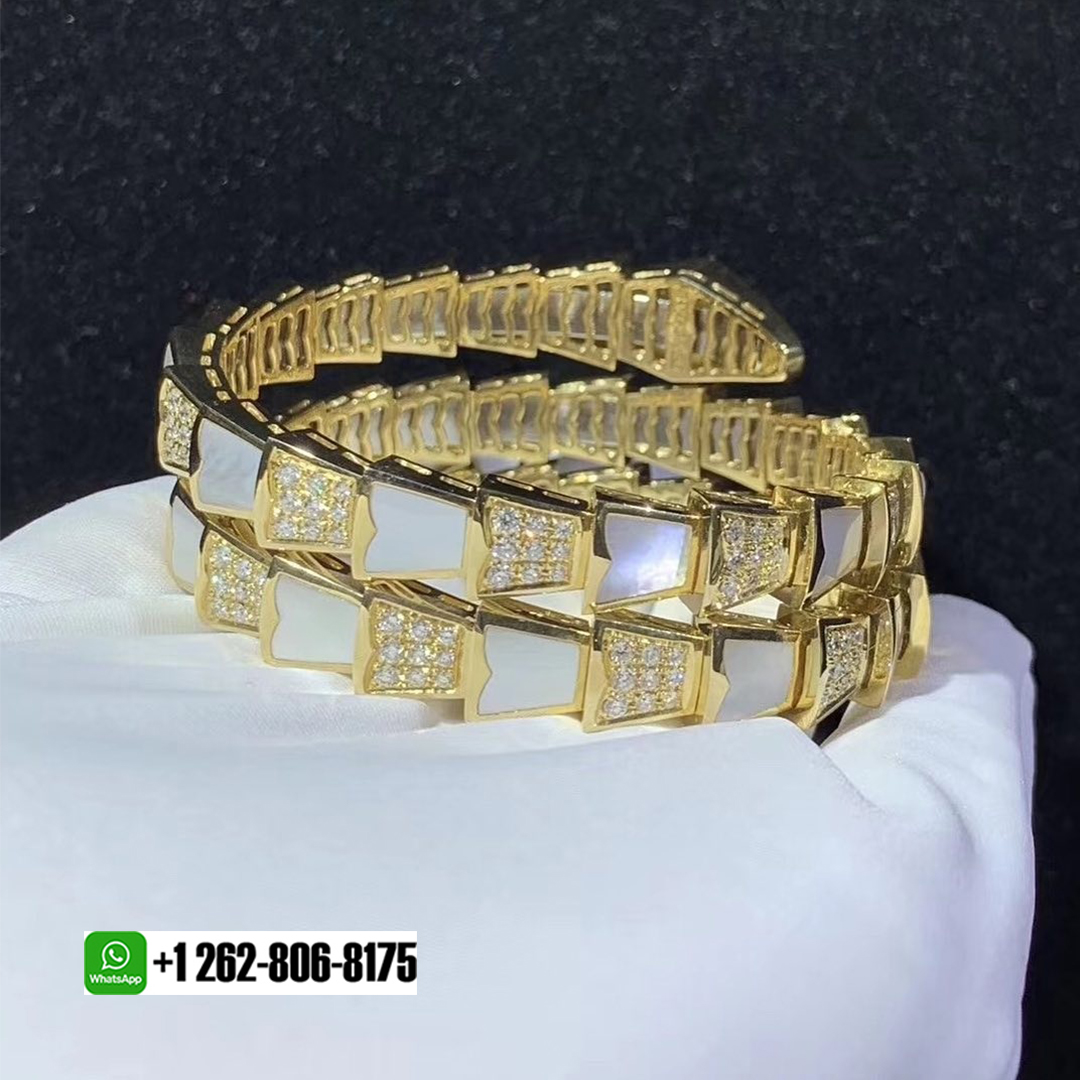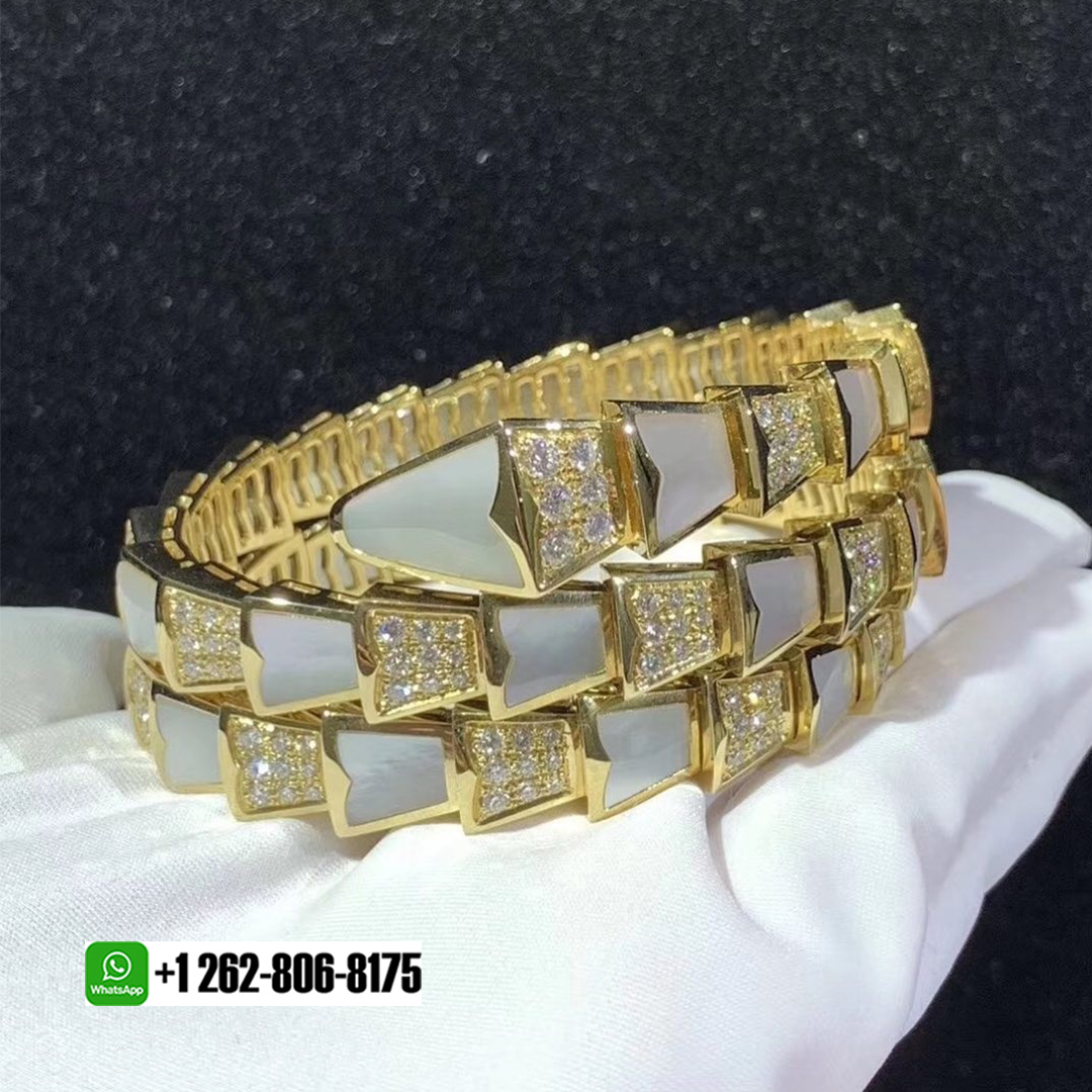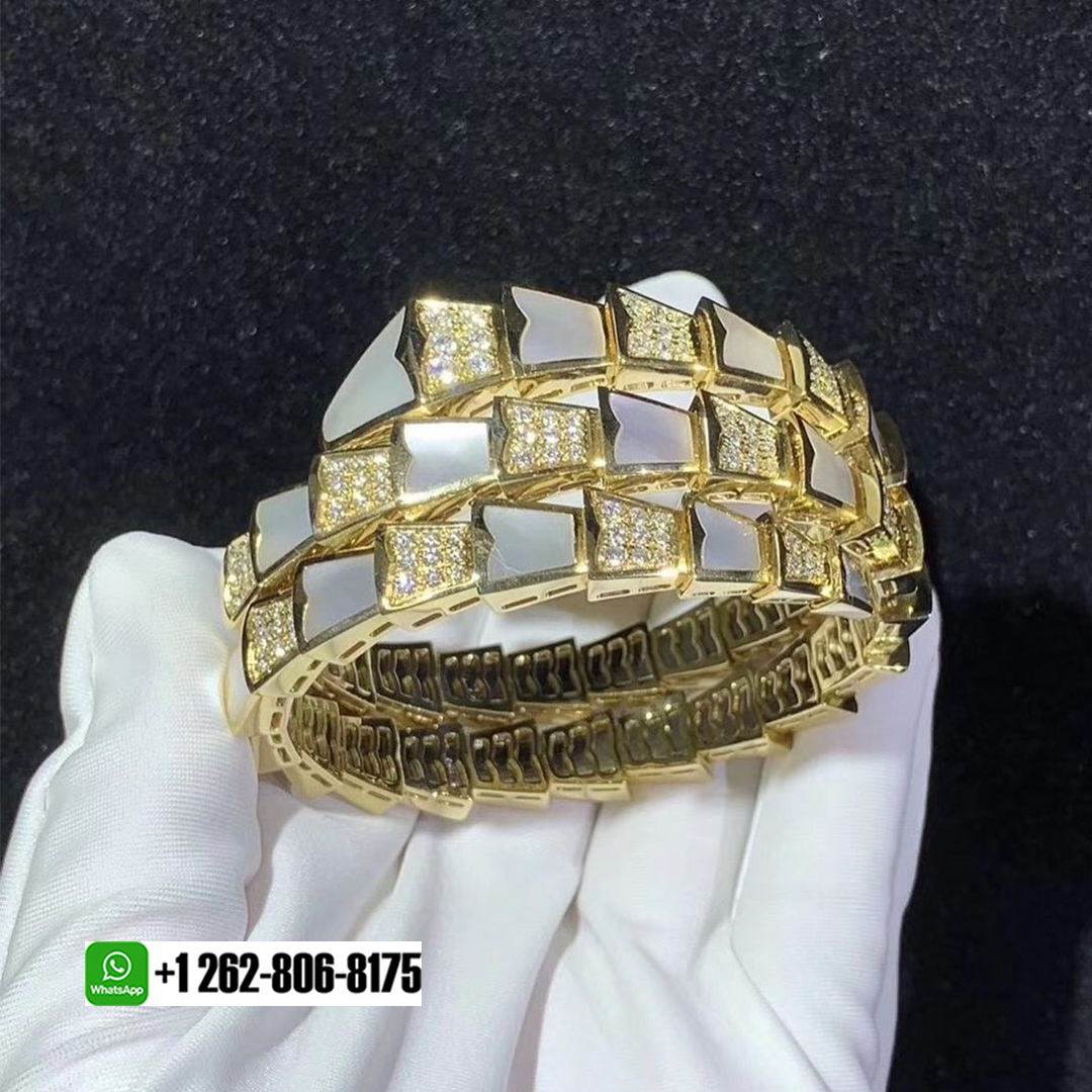 In a tribute to its spirit of animal, Bulgari captures the power of seduction in this Serpenti bracelet, camouflaging sensuality and temptation with a hypnotic design. Sophisticated and glamorous, this jewel coils around the wrist striking with the precious beauty of the scales and with the distinctive sinuosity of the snake. The snake bracelet coils to make the bracelet stating the Bvlgari size is a Medium. It is made out of 18K Yellow Gold with approximately 7.00 carats of pave diamonds. Also has 26 mother of pearl elements.