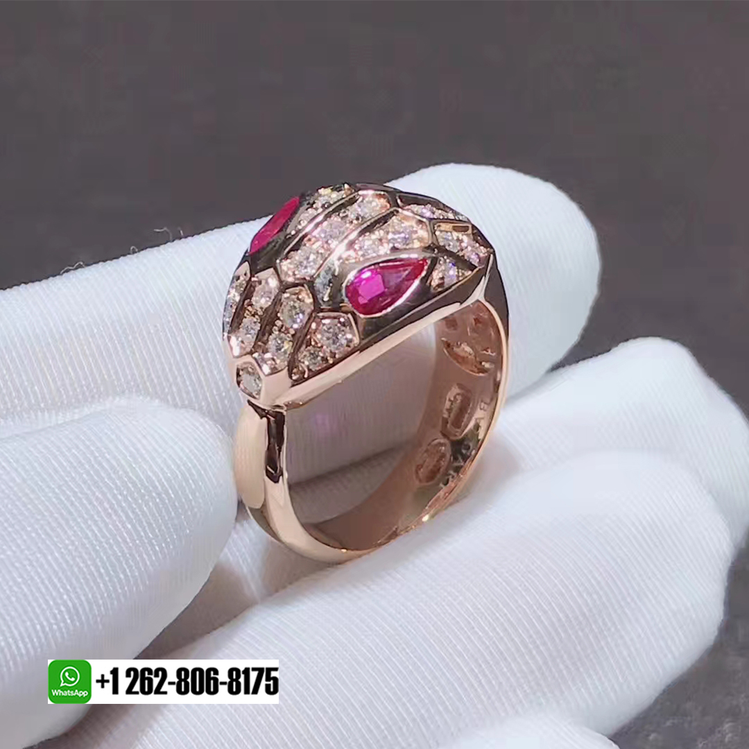 Serpenti ring in 18 kt rose gold, set with rubellite eyes and full pavé diamonds.