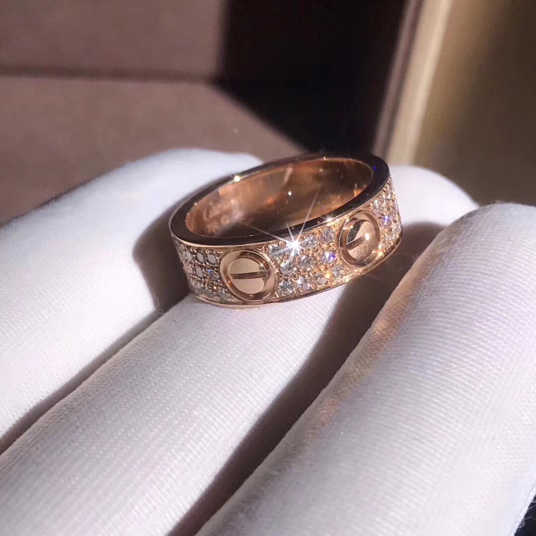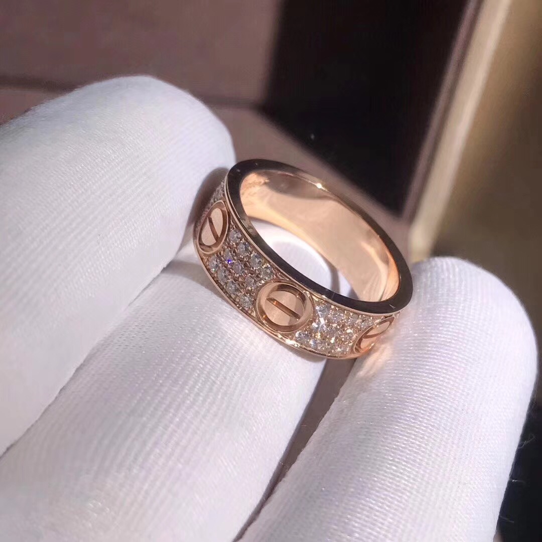 • Cartier 18k Rose Gold Diamond Paved Love Ring 6.5MM Band B4087600