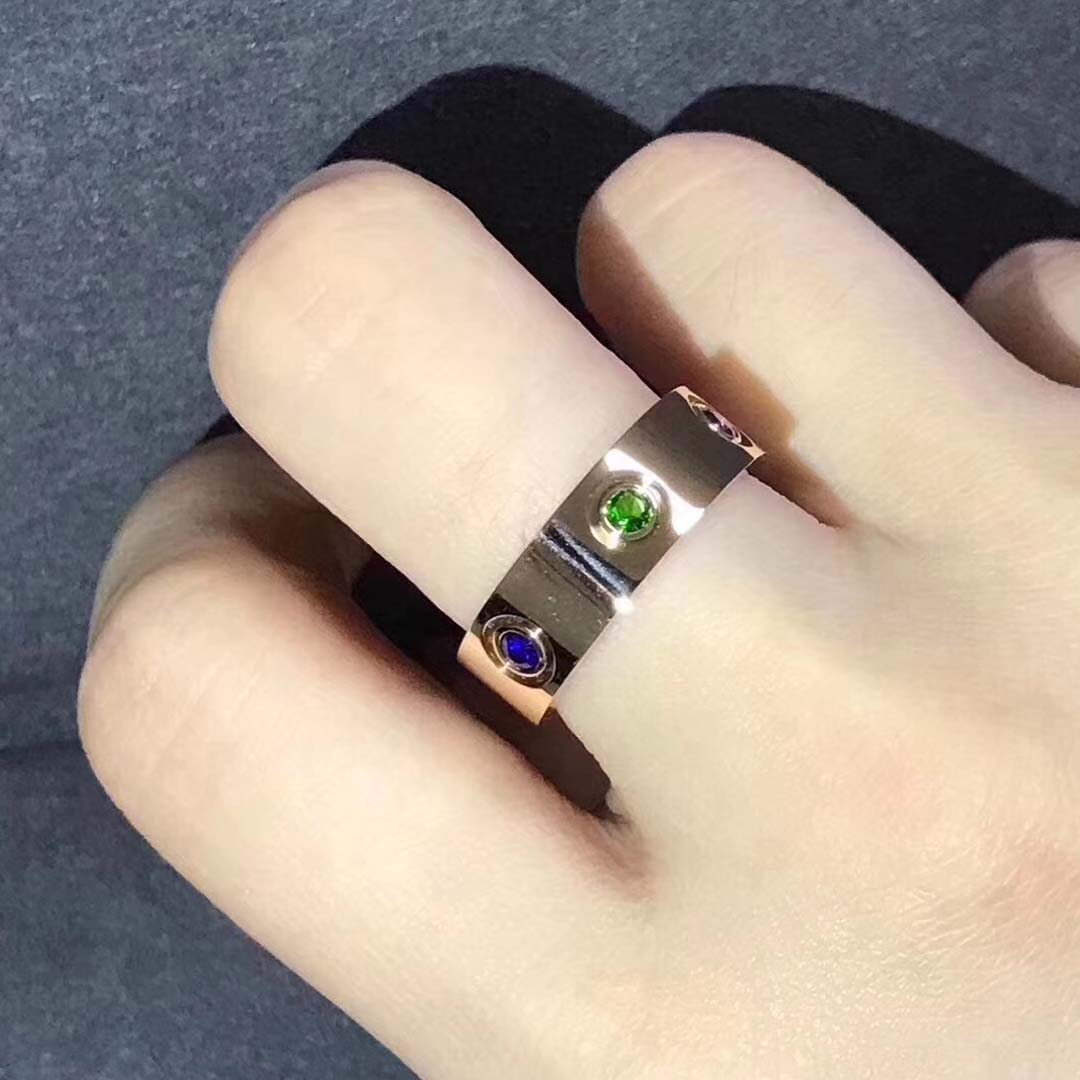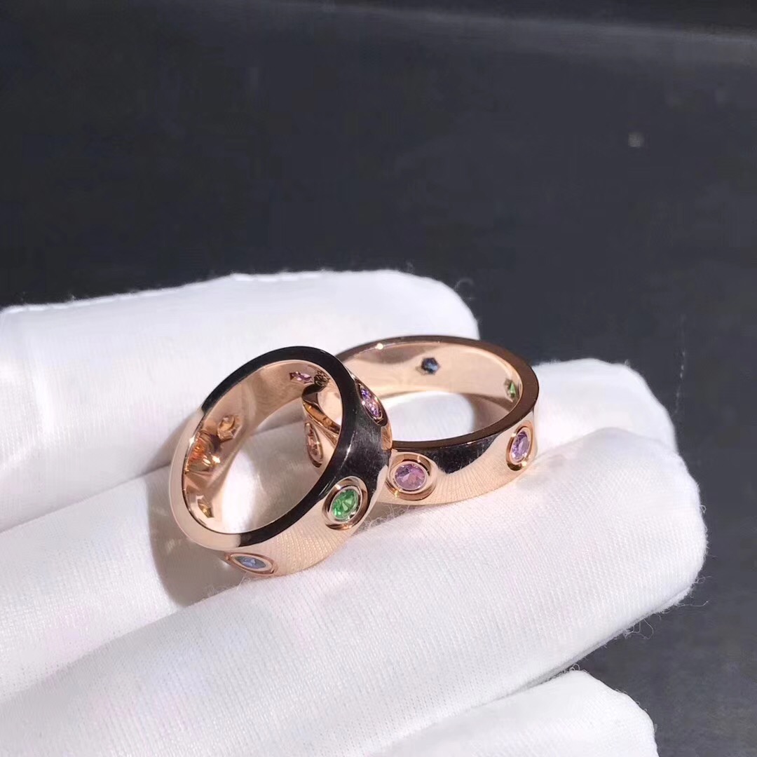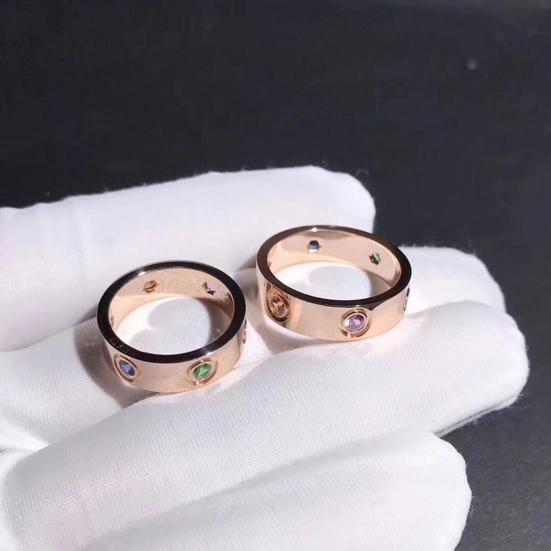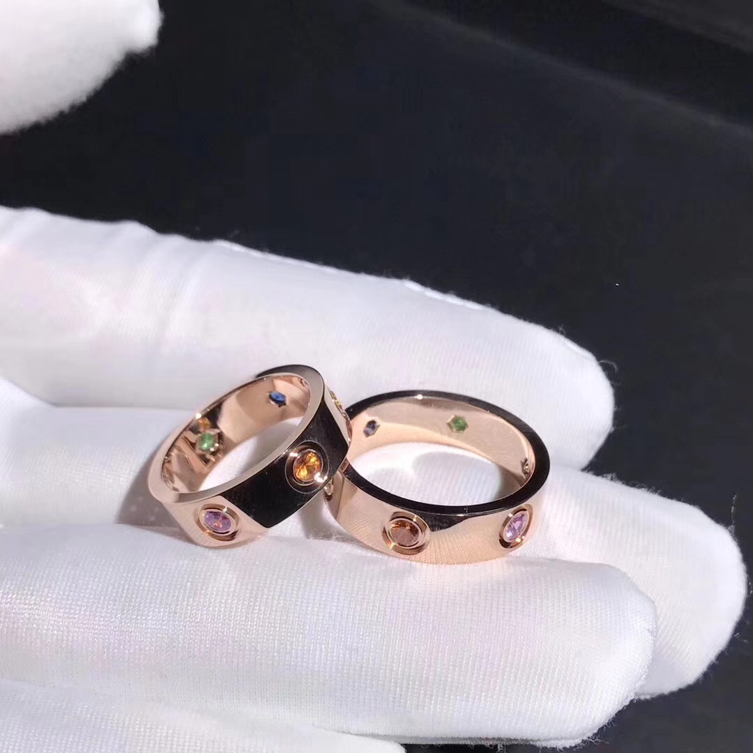 Cartier Love ring, 18K rose gold, set with 1 rose sapphire, 1 blue sapphire, 1 yellow sapphire, 1 green garnet, 1 orange garnet and 1 amethyst.