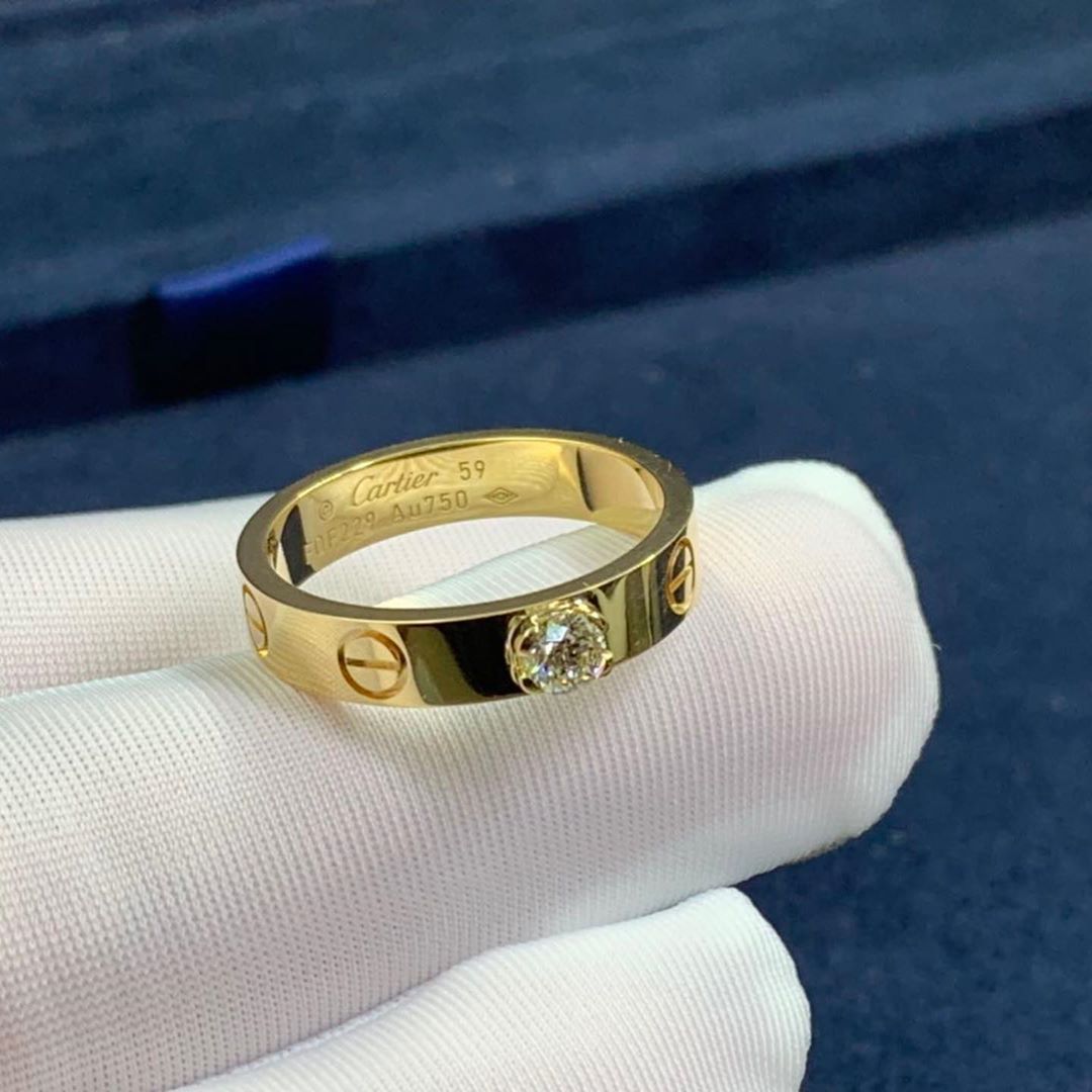 Love Solitaire, 18K yellow gold, set with a brilliant-cut diamond available from 0.23 to 1.15 carats. Width: 3.65 mm for metric sizes 42 to 56 and 4 mm for metric sizes starting from 57. Thickness: 1.4 mm.