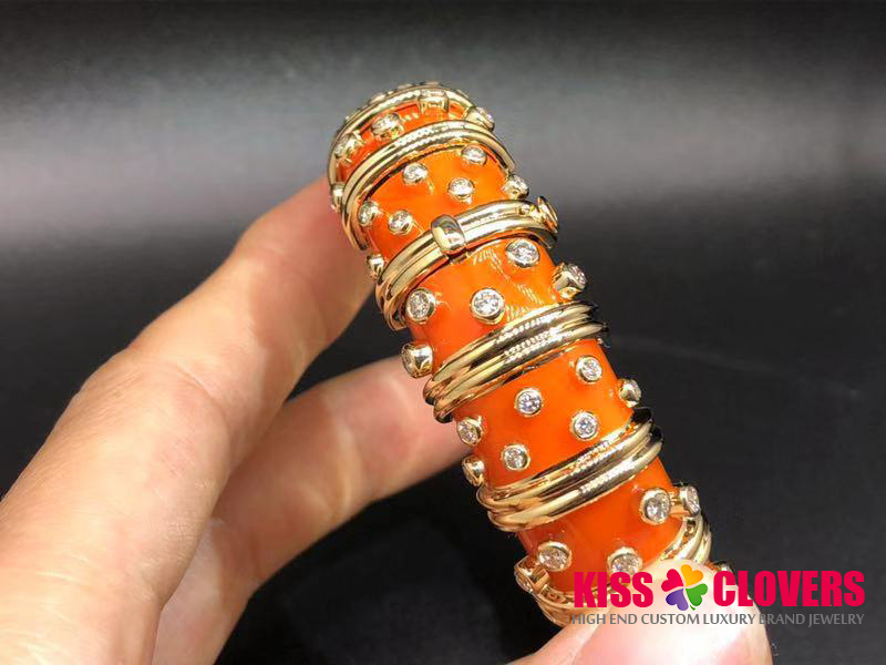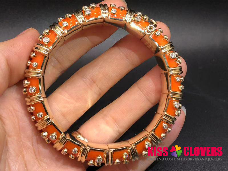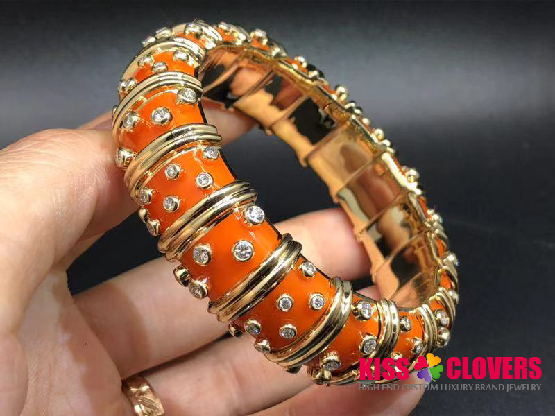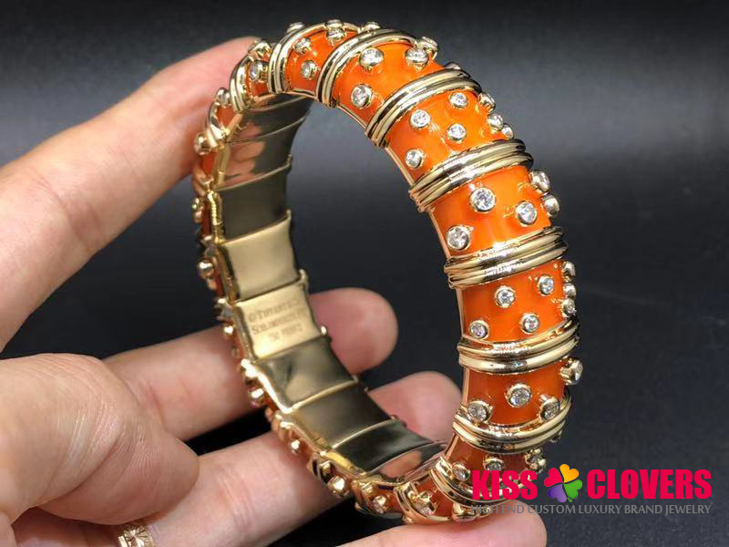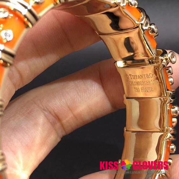 • Tiffany & Co. 18K Yellow Gold Jean Schlumberger Orange Enamel Diamond Bangle Bracelet