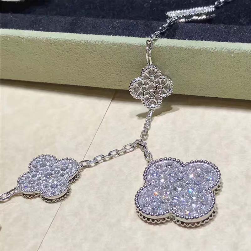 If you are interesting in this custom made Van Cleef & Arpels 18k White Gold 5 Motifs Diamond Magic Alhambra Clover Bracelet, here at 18kluxury.com, we can do specially for you in amazing price. 100% mirror quality, Same as original but cost much less!Top workmanship and factory direct selling. Please inquire us via E-mail [email protected] or Whatsapp +1 (262)806-8175 for pricing.