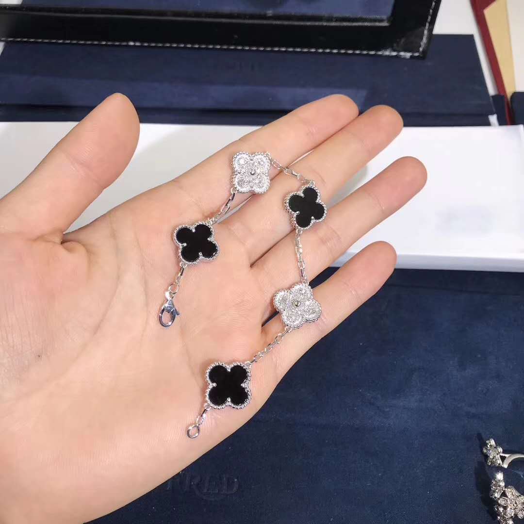 Vintage Alhambra bracelet, 5 motifs, white gold, onyx, round diamonds; diamond quality DEF, IF to VVS.
