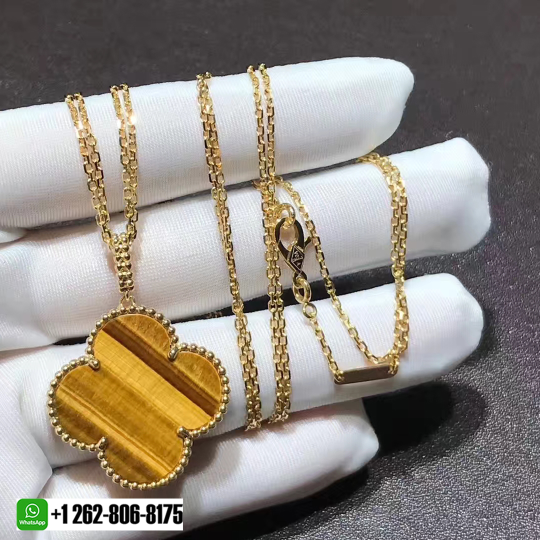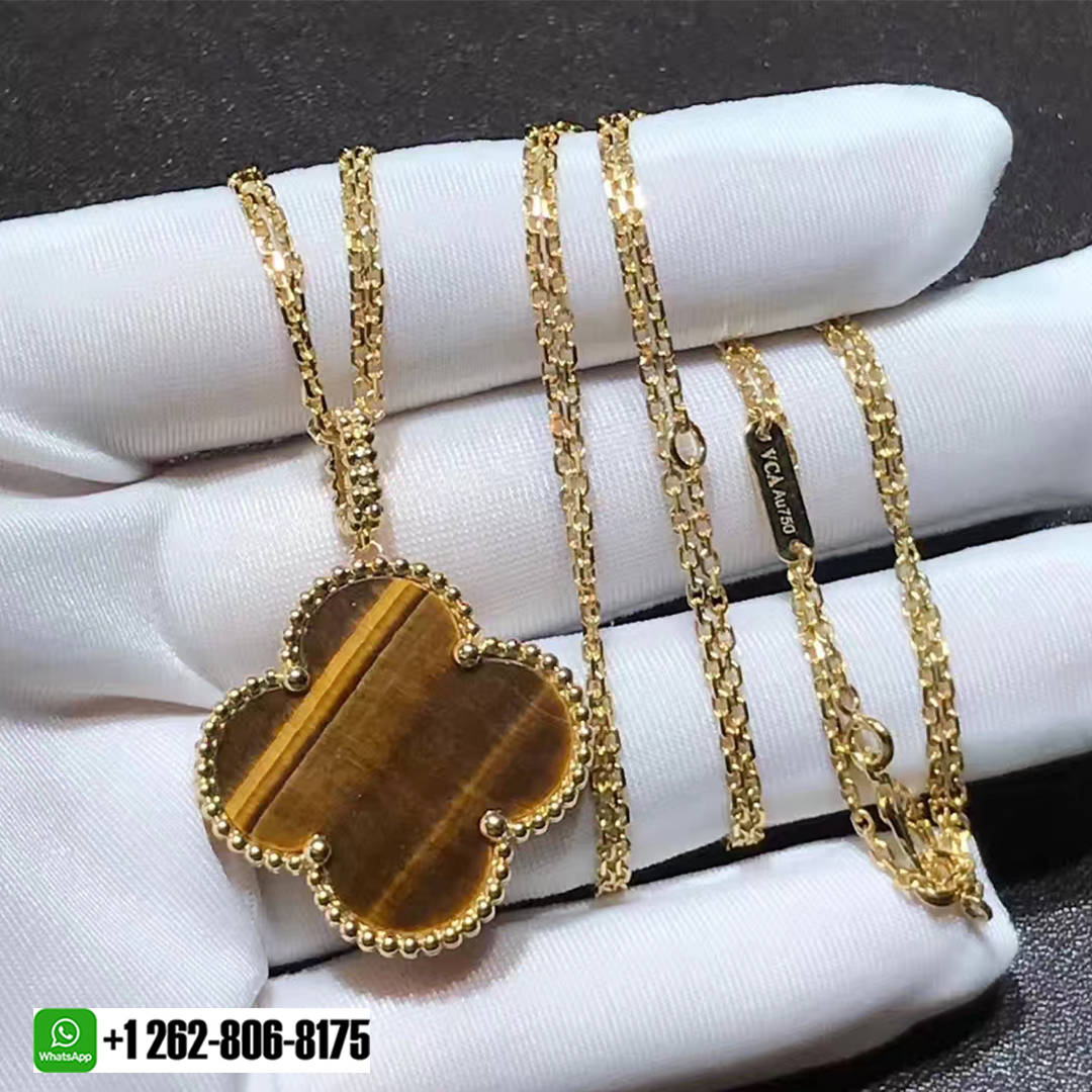 The Magic Alhambra collection by Van Cleef & Arpels was first created in 2006 and has thus gone on to enjoy the love of women from around the world for its elegance and artistry. This necklace is from that collection, and it is so beautiful, it deserves to be on you. Made from 18K yellow gold, the pendant is shaped like a clover leaf and inlaid with tiger eye. The pendant is then outlined in their fine work of beads and strung on a chain that has a lobster clasp. You may have the pendant in a single chain or by doubling it up.
