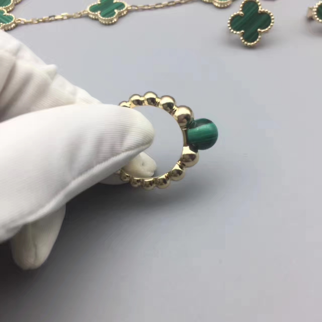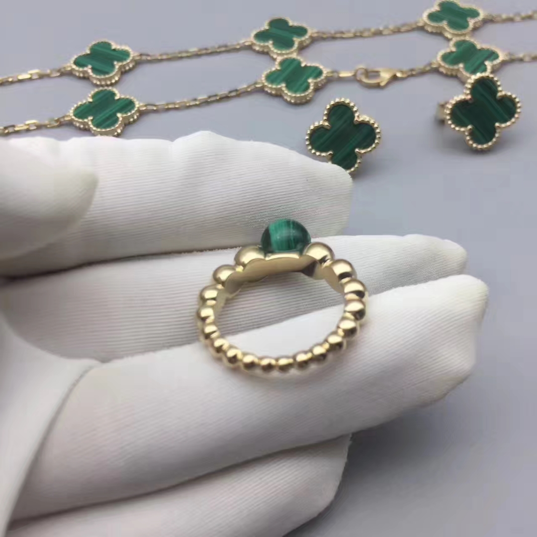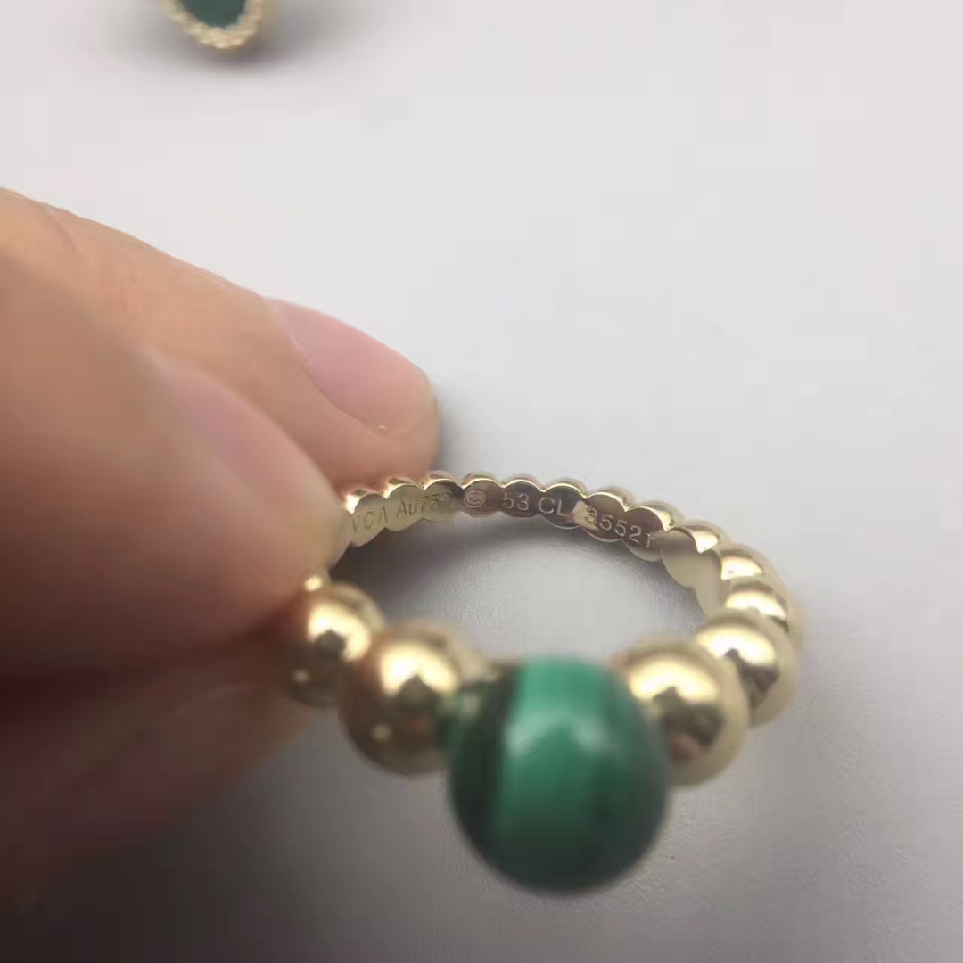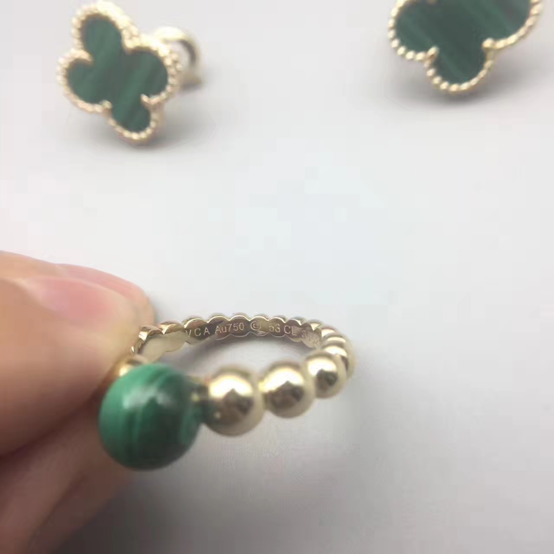 A vivid green malachite and yellow gold stacking ring from the Perlée Couleurs collection by Van Cleef & Arpels. This striking beaded gold ring is made up of graduating polished yellow gold beads that increase in size as they reach the crown, which is set with a polished round malachite. Hand selected by Van Cleef & Arpels to ensure that the green gemstone meets the maison’s exacting standards, the malachite glows with variegated emerald tones. As a member of the Perlée collection, which features the delicate pearled edging technique, this malachite ring is wonderful worn alone or stacked with others in the collection.