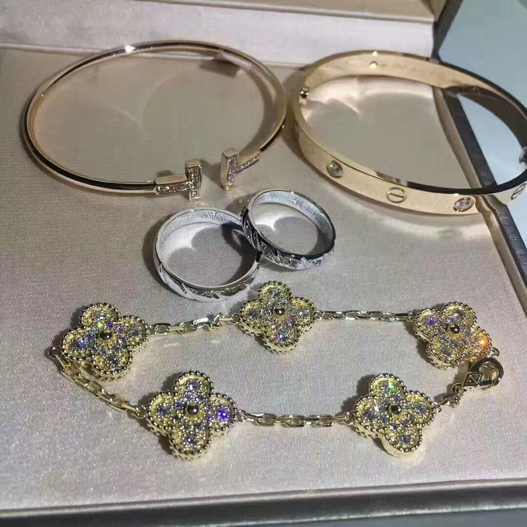 Vintage Alhambra bracelet, 5 motifs, yellow gold, round diamonds; diamond quality DEF, IF to VVS.